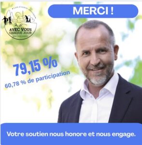 - Liste « AVEC VOUS CHAQUE JOUR » : Elle remporte l’élection dès le premier tour avec un score massif de 79,15 %, soit 5 663 voix. La liste a dominé dans l’ensemble des douze bureaux de vote de la commune, dépassant même la barre des 80 % dans plusieurs bureaux comme à l’Atrium (n°1), aux Grands Champs (n°6), au Château Fraisier (n°7) ou encore aux 11 Arpents (n°10 et n°11).
